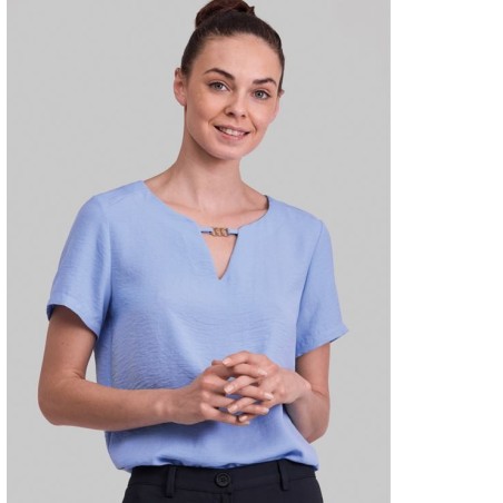 Blusa de cuello redondo con aplique metálico en el escote. Manga corta y bajo recto. Tejido tipo bambula sin necesidad de plancha. Confortable y de cómodo mantenimiento.