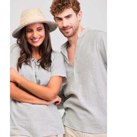 Blusa con aire bohemio, cuello redondo y escote pico con frunces ajustable por cordones. Manga ranglán corta y bajo con aberturas. Tejido ligero y fresco que imita al lino de aspecto rústico.