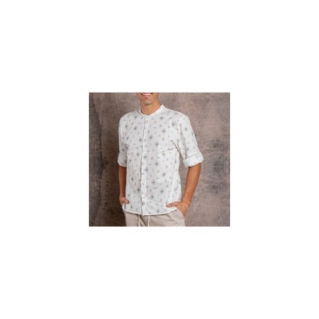 Camisa unisex con cuello mao y recogemangas. Cierre con botones, los 3 primeros vistos y el resto con botonadura oculta. Fabricada con algodón orgánico y diseño Navajo.