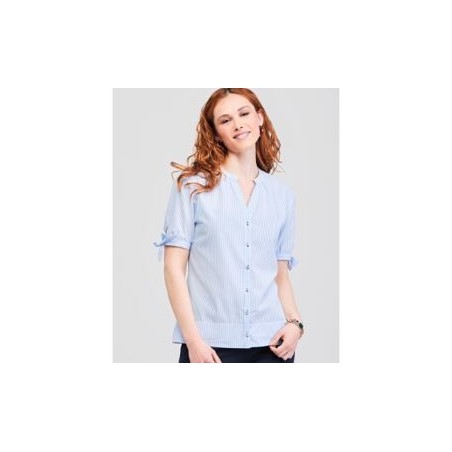 Camisa con escote pico de cuello mao, manga corta con lazo. Tejido seersucker de rayas de algodón orgánico.
