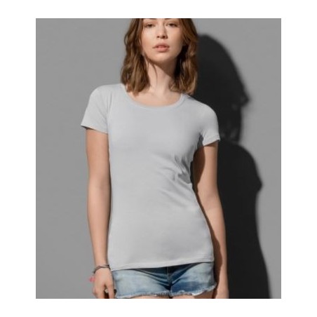 Camiseta de mujer slim fit de 170 g/m² en mezcla de algodón con elastano. Con escote, tiene el cuello redondeado terminado con un canalé estrecho y una cinta interior contrastada. Manga corta con detalle de pespunte en el bajo. Una camiseta con un diseño más informal y casual.
