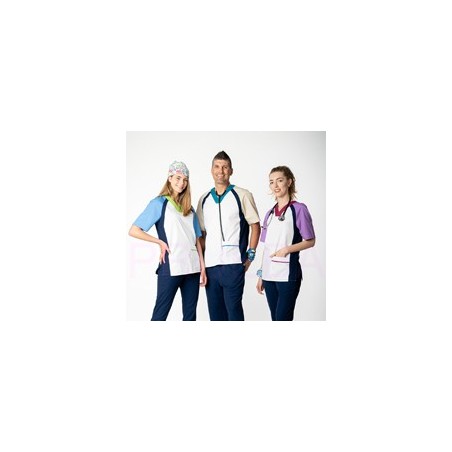 Casaca cuatricolor unisex, cuello en V y manga corta, bolsillo inferior parte izquierda. Mangas ranglan y aberturas laterales. Fabricada con poliester obtenido del reciclado de botellas de plástico, algodón sostenible (certificado BCI - Better Cotton Initiative) y tejido natura.Te encantará si buscas una casaca divertida, alegre y de gran comodidad. Gracias a la forma de la manga y las aberturas tendrás gran amplitud de movimiento. Se convertirá en tu prenda favorita si además de confort buscas un uniforme sostenible y respetuoso con el planeta.