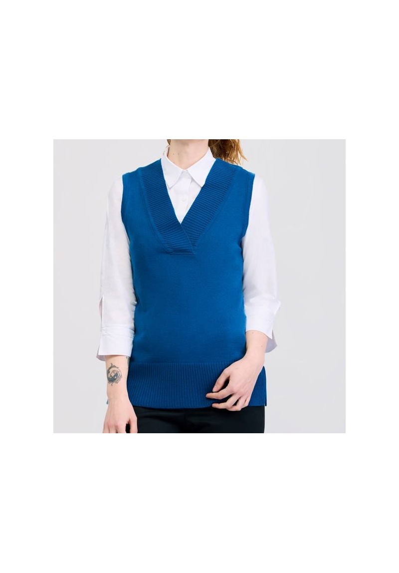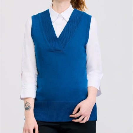 Chaleco de mujer con escote pronunciado de acabados acanalados. Lleva aberturas en los costados. Fabricado en punto acrílico low pilling que garantiza sus propiedades para un uso prolongado.