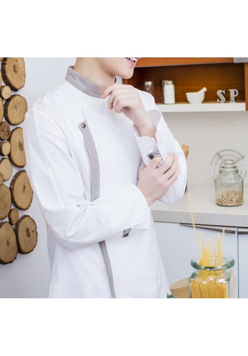 Chaqueta cocina unisex manga larga, cierre asimétrico con automáticos ocultos. Contrastada