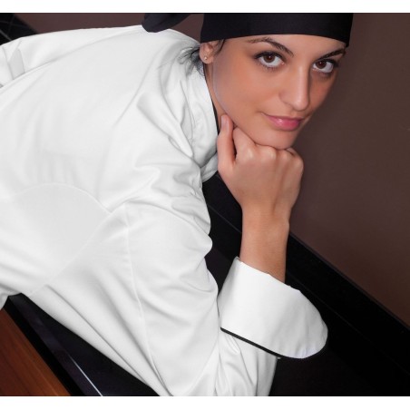 Chaqueta cocina mujer manga larga con puño vuelto y costadillos posteriores de Natura®. Vivo a contraste. Cierre con automáticos ocultos