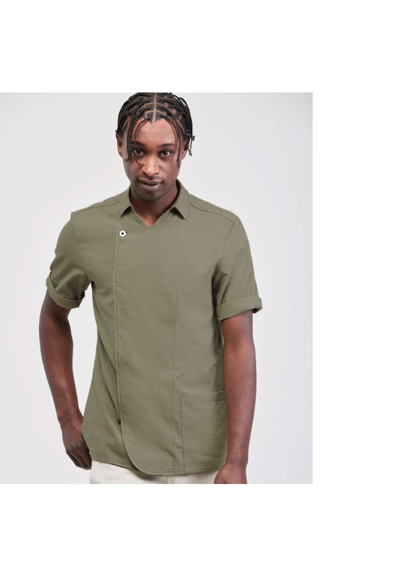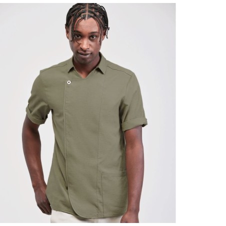 Chaqueta de cocina con cuello solapa abierto. Cierre frontal cruzado con detalle metálico. Manga corta redoblada estilo casual y un bolsillo de parche en la altura de la cadera. Tejido de algodón suave que aporta ligereza y transpirabilidad.