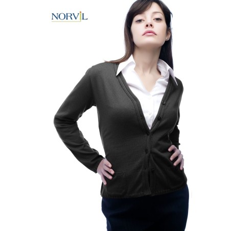 Chaqueta de mujer con escote pico. Cierre frontal con botones y dos bolsillos de parche con acabado acanalado en la altura de las caderas. Fabricada en punto acrílico low pilling lo que minimizará el aspecto envejecido con el uso y lavado prolongado.