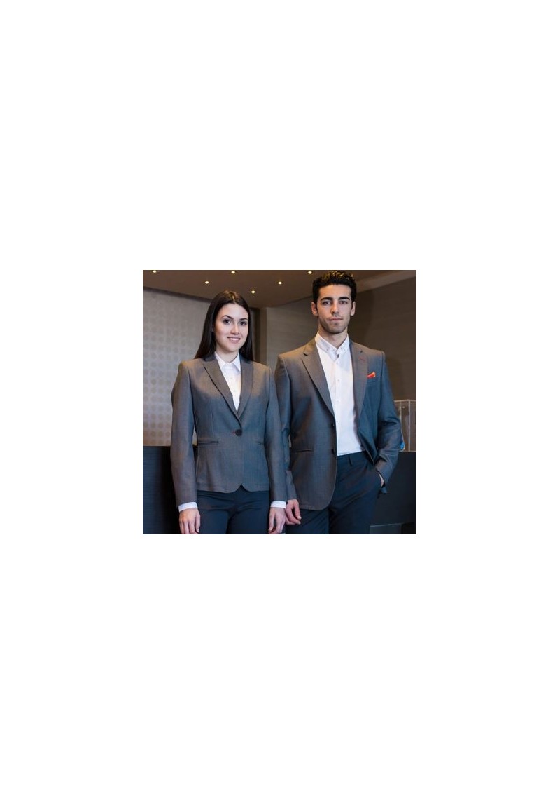 Blazer relaxed fit. Cuello con solapas de muesca. Manga larga con coderas. Bolsillos de dos vivos en la altura de las caderas. Bajo con abertura en espalda. Cierre frontal de botones con ojal contrastado. Interior con medio forro. Confeccionada en tejido ojo de perdiz, un tejido liviano con minidibujo en tonos gris y negro que contrasta con el color rojo de los ojales y del forro interior.