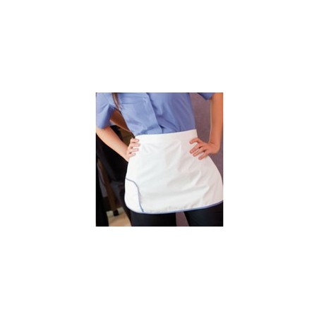 Delantal corto con dos pliegues y biés contrastado en contorno de faldón y alrededor del bolsillo.