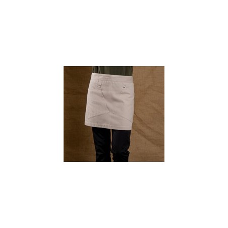 Delantal corto con dos bolsillos inclinados. Arandelas metálicas en cintura con cincha de 30mm cosida a cada arandela. Fabricado con algodón orgánico.