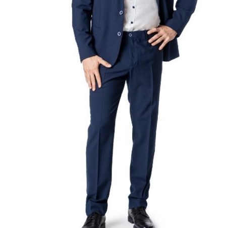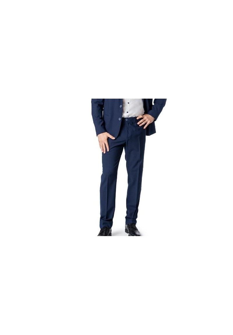 Pantalón caballero sin pinzas. Bolsos laterales, uno relojero en lado derecho y dos traseros con dos vivos con botón. Cintura con 6 pasadores.