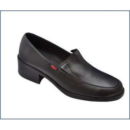 Zapato femenino con cierre de elásticos laterales, de piel micro D'COVER PLUS®, forrado en la pala con tejido técnico D'DRY®. Horma recta de puntera redondeada. Plantilla acolchada de tejido sobre espuma de poliuretano con tratamiento antibacterias y carbón activado. Suela de poliuretano antideslizante.