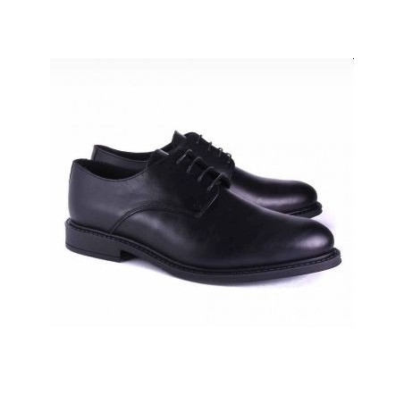 Zapato blucher de hormbre en piel de vacuno color negro con cordones de algodón cabeteados. Suela de caucho termoplástico y plantillas con almohadilla.