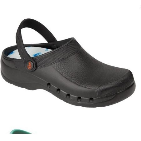 Zueco ultraligero de EVA, libre de látex, anatómico y antideslizante. Con correa posterior abatible entre el talón y la pala. Perforado en los laterales. Plantilla interior de tejido sobre espuma de poliuretano con tratamiento antibacterias. Certificado CE, directiva 89/686/CEE. Categoría I. SRA.
